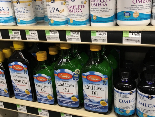 アメリカの市場を知るために訪れたドラッグストアで出会った「Cod Liver Oil」。Cod=鱈、Liver=肝臓、Oil=油です。セルフメディケーションの概念において日本より何歩も先を行くアメリカでは、スーパーでもドラッグストアでもサプリメントショップでも、オメガ3をはじめとするオイルの商品が棚一面に並んでいます。その中から特に人気があると現地の栄養士さんが教えてくれたのが「Cod Liver Oil」でした。成分を見ると、単にオメガ3(EPA・DHA)だけではなく、ビタミンAやビタミンDも含まれていることがわかります。(さらに、おそらくビタミンEを添加しているからだと思いますが、酸化しにくいオメガ3だと教えてくれました。)