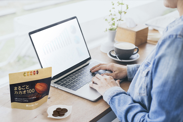 『まるごとカカオ100』は、1袋100g当たりにカカオポリフェノール3,960mg、テオブロミン1,100mgを含み(参考値)、健康と美容をサポートします。仕事や勉強に集中したいとき、甘いものが苦手な方のおやつやおつまみに。ゴルフや山登りに持っていく方もいらっしゃいます!