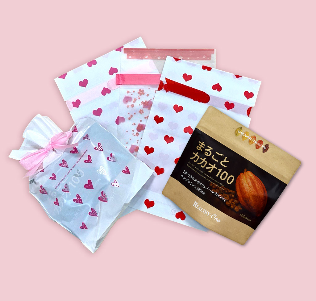 1月21日(水)~2月14日(水)の期間中、『まるごとカカオ100』をご購入のお客さまへ、1袋につき1つ、ラッピング袋を同梱させていただきます。4種類の内からランダムにて同梱いたします。