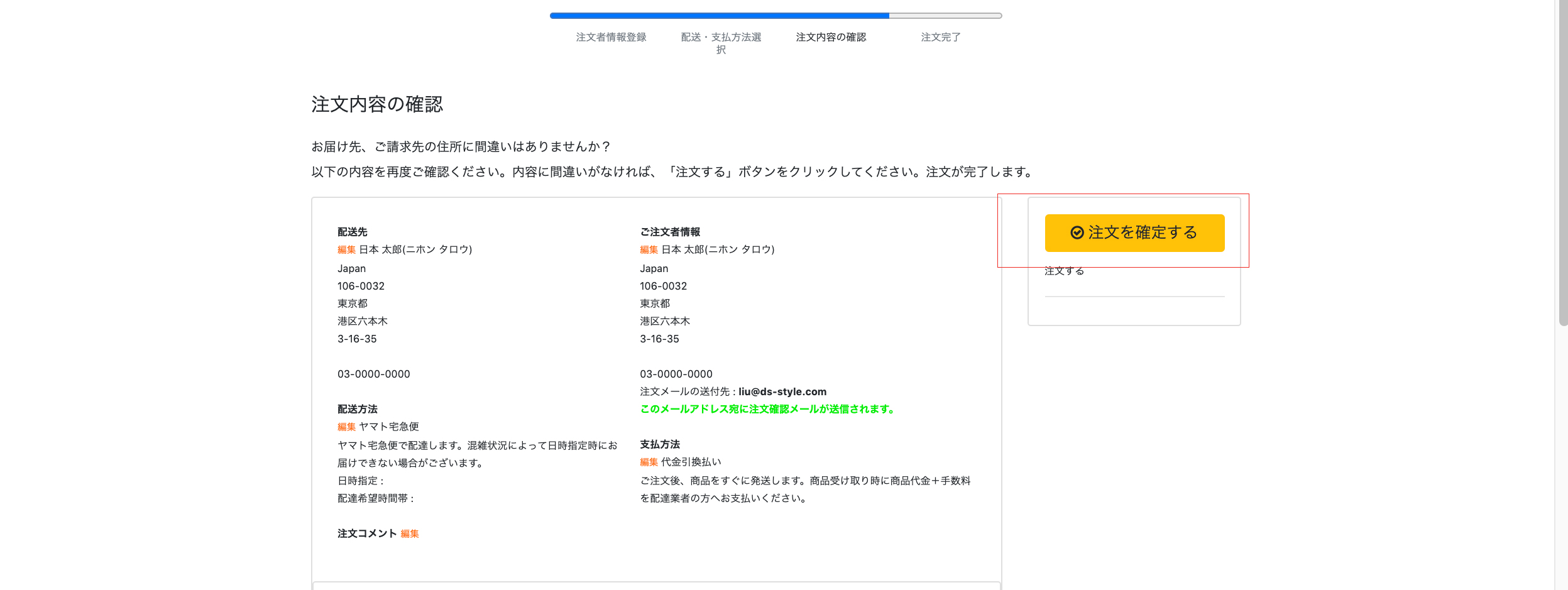 注文内容の確認ページでは、ご注文商品やお買い物合計金額、お届け先情報など、ご注文に関する情報のすべてを表示しています。この画面でご注文内容をご確認いただき、内容がよろしければ「注文する」ボタンをクリックしてください。