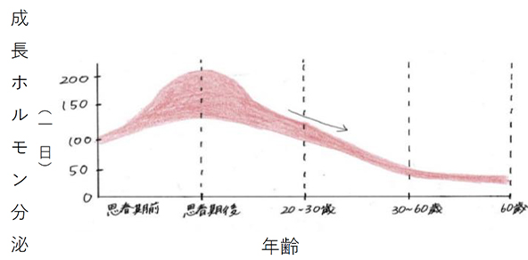 全身のアンチエイジングに必要な成長ホルモンですが… 分泌量は思春期後をピークに徐々に減少し、40歳には半分以下に。