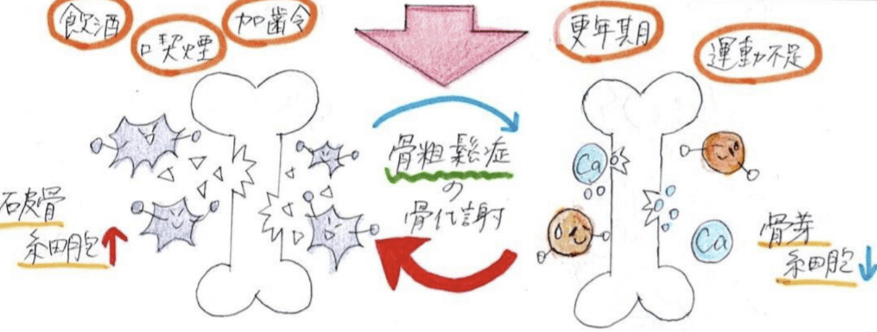 しかし、加齢や更年期などにより、破骨細胞の活動が活発になり、骨芽細胞は少なくなってしまうことにより、骨代謝のバランスが崩れて骨量が減少していき骨粗鬆症などに繋がっていくのです。