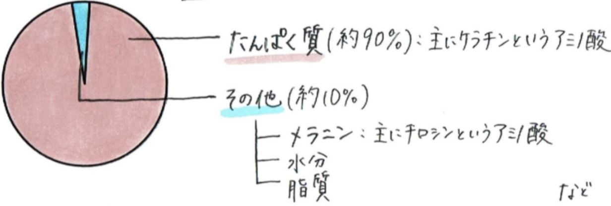 18種類のアミノ酸からつくられるたんぱく質で、このうちメインのアミノ酸は「シスチン」「グルタミン酸」「アルギニン」です。